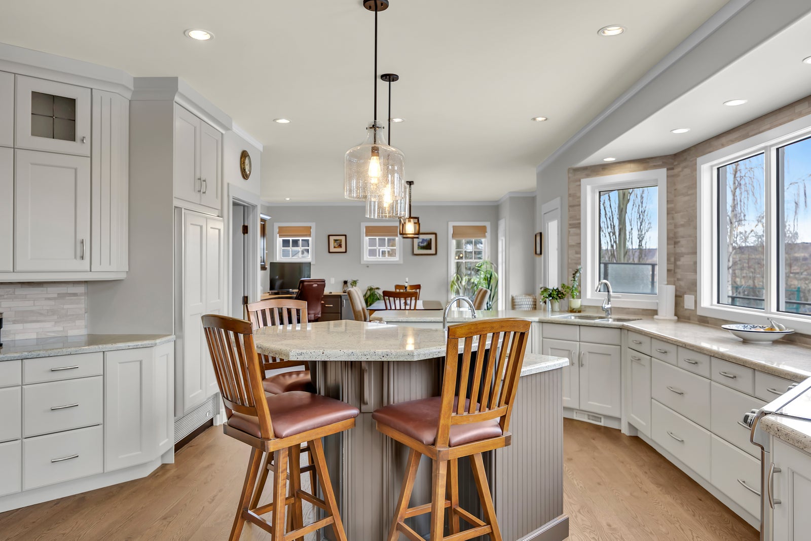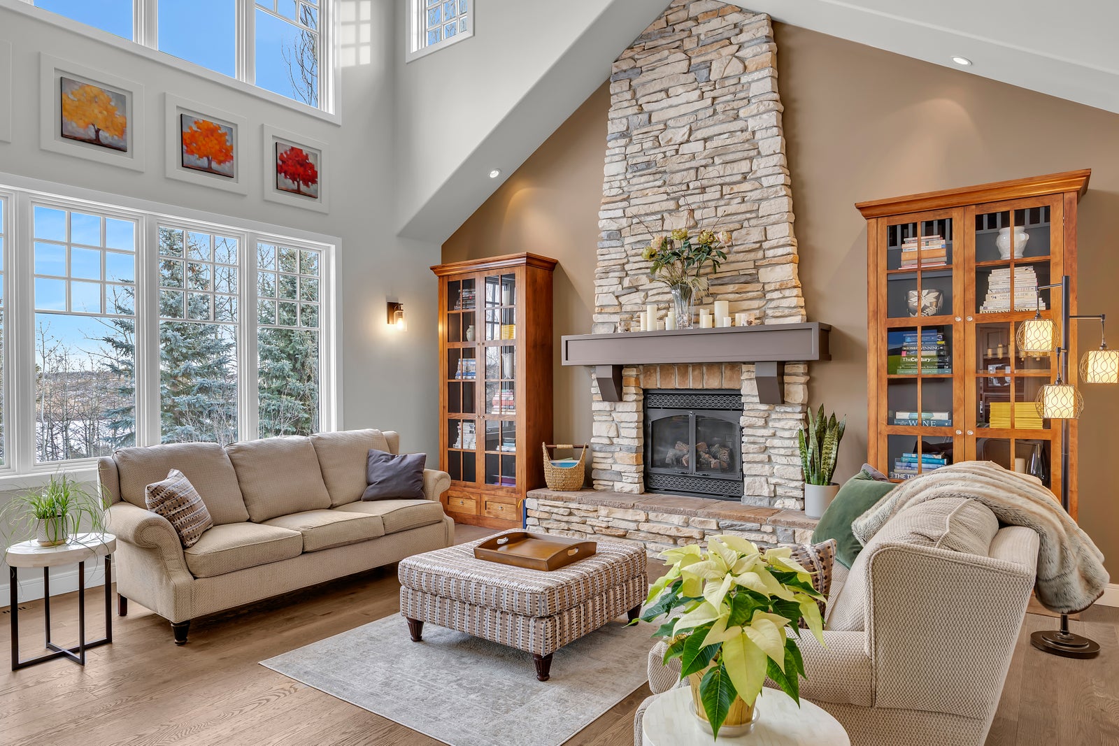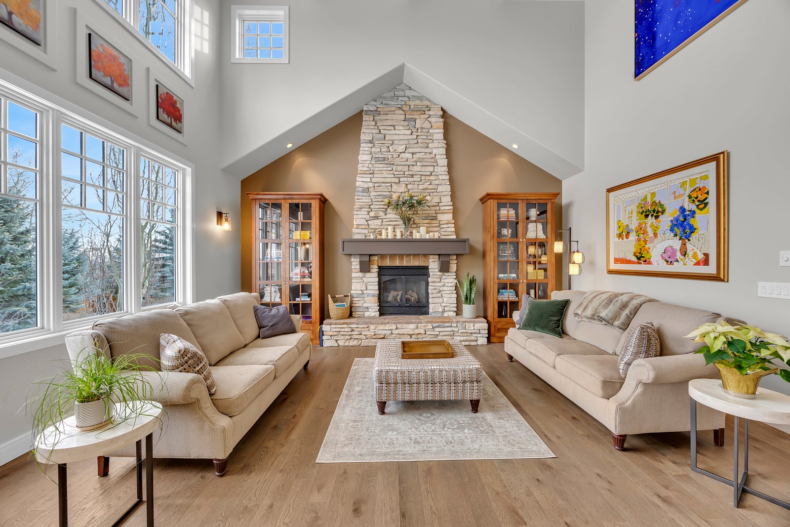 The main floor is the heart of the home, anchored by a stunning CUSTOM KITCHEN featuring Miele and Sub-Zero appliances, granite countertops, an oversized island, and abundant storage—ideal for busy mornings, family meals, and effortless entertaining. An adjacent informal dining area creates a comfortable everyday gathering space, perfect for quick breakfasts or casual weeknight dinners, while tranquil views of Emerald Bay through the trees make your morning coffee a daily pleasure. A VAULTED LIVING ROOM with a striking full-height stone gas fireplace offers a warm and welcoming retreat, and the formal dining room easily accommodates special occasions—or can be reimagined as a sophisticated home office to suit today’s professional lifestyle. Thoughtfully placed windows flood the home with NATURAL LIGHT throughout the day.